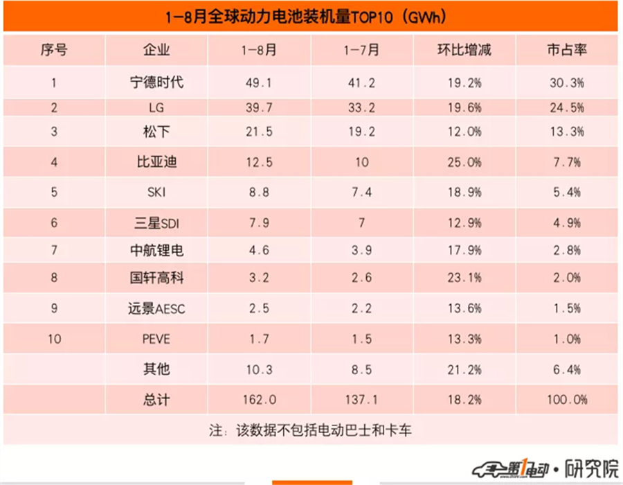 累計來看,1-8月全球動力電池裝機量為162GWh,環比增長18.2%。全球前十動力電池企業裝機量為151.7GWh,市占率達93.6%,市場集中度進一步提升,其中寧德時代、LG、松下、比亞迪、SKI穩居前五。