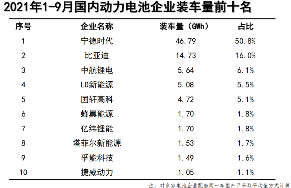 中國(guó)汽車動(dòng)力電池產(chǎn)業(yè)創(chuàng)新聯(lián)盟數(shù)據(jù)顯示,今年1-9月,國(guó)內(nèi)動(dòng)力電池企業(yè)裝車量前5名分別為:寧德時(shí)代(占比50.8%)、比亞迪(占比16.0%)、中航鋰電(占比6.1%)、LG新能源(占比5.5%)、國(guó)軒高科(占比5.1%)。