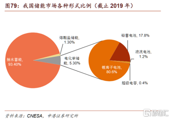 目前儲能的主要方式有抽水蓄能、電化學(電池)儲能、熔融鹽儲能等。其中,抽水蓄能占據(jù)絕大多數(shù)的市場份額。截至2019年,國內抽水蓄能占比93.4%,電化學蓄能僅占比5.3%。