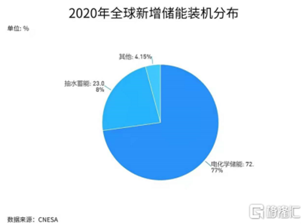 在2020年的新增儲能裝機中,電化學儲能的裝機率已經達到了近73%,成為了目前主流的新增儲能裝機方式。
