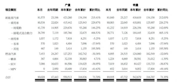 比亞迪汽車10月全系銷售89935輛,同比增長88.42%;其中,新能源汽車銷量為81040輛,同比增長249%;燃油汽車銷量僅為8895輛,占總銷量比例不足一成。