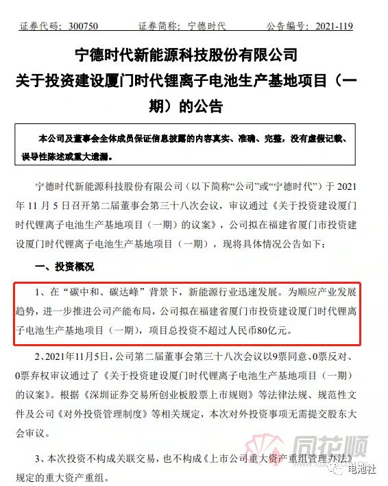 此外,寧德時代再發公告顯示,擬在福建省廈門市投資建設廈門時代鋰離子電池生產基地項目(一期),項目投資總額不超過80億元,資金來源為企業自有或自籌資金。