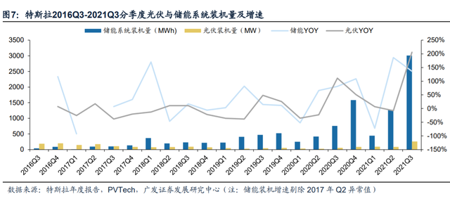 而統計數據一定程度上也佐證了這一發展方向。2015-2020年,特斯拉發電儲能業務收入復合增速達82.09%。今年Q1-Q3,特斯拉儲能裝機規模達4.73GWh,同比增長230.64%;光伏裝機量達437MW,同比增長267.23%,其中,Q3兩項裝機規模均創單季度新高。