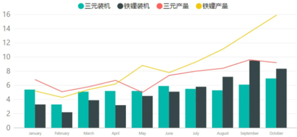 1-10月,三元電池產量累計72.0GWh,占總產量45.1%,同比累計增長165.0%;磷酸鐵鋰電池產量累計87.5Wh,占總產量54.8%,同比累計增長378.2%。從累計增速的同比增長和占比來看,磷酸鐵鋰在中國還是唱主角的。