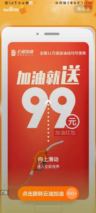 有體驗過的用戶稱,從12月1日起,打開百度地圖App后,即可隨機看到云油加油“首充100領99”的活動宣傳圖,通過上滑或點擊進入活動頁面,填寫相關資料,下載云油加油App,即可領取99元加油券。