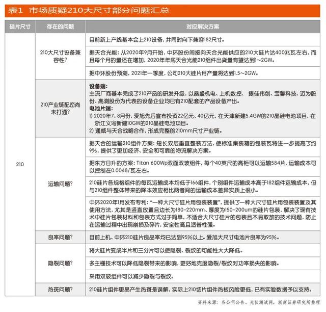 市場接受度且先不談,對于光伏組件廠家來說,這兩條路徑選擇的最大沖突集中于投入成本和風險上。如果選擇第一條路徑,相對來說,廠家需要耗費產線升級及相關人力投入的成本,但第二條路徑卻需要新建產線乃至廠房,其中購買新設備就是一筆大投入。兩相比較,后者投入的成本更高、冒的風險更大。這也是在初期天合光能在行業內倡導生產和使用210硅片卻得不到上下產業鏈支持的主要原因。如今,經過兩年多的努力,天合光能將210硅片的盟友發展到39家,包括上游供應商、下游應用客戶乃至同行。目前,182硅片和210硅片兩條路線已經成為未來光伏組件廠家拓展大尺寸市場的選擇。但相比于182硅片,210硅片的“大躍進”也讓其充滿質疑,比如在設備兼容性、產業鏈配套、運輸、良率、熱斑等等方面。根據浙商證券整理,如表1所示,天合光能、中環股份、晶盛機電、上機數控、愛旭股份、通威集團、東方日升等上下游已經就210大尺寸存在的問題進行研發、解決。