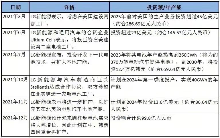 為縮小與寧德時代之間的差距、開拓新的市場布局,2021年以來,LG新能源在全球范圍內擴大其電池產(chǎn)能。