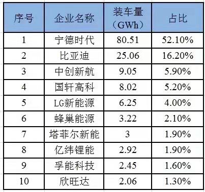 2021年1-12月國內動力電池企業(yè)裝車量前十名