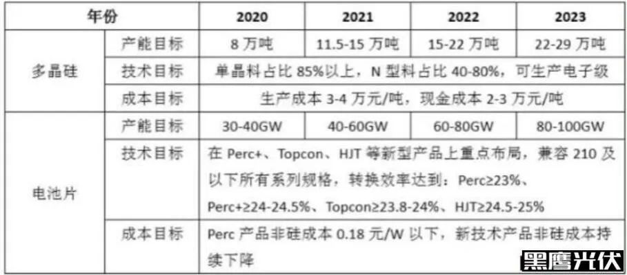 此外,太陽能電池業(yè)務(wù)的累計(jì)產(chǎn)能目標(biāo)分別為:2020年30至40GW, 2021年40至60GW,2022年60至80GW,2023年80至100GW。同時(shí)重點(diǎn)布局Perc+、Topcon、HJT等新型產(chǎn)品技術(shù)且兼容210及以下所有系列,Perc非硅成本0.18元/w以下。