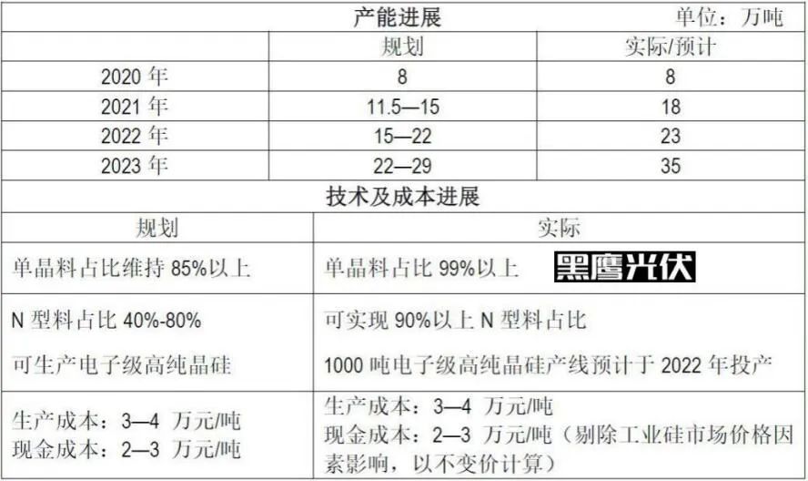 根據(jù)當(dāng)時(shí)公告,通威中期發(fā)展規(guī)劃明確:高純晶硅業(yè)務(wù)的累計(jì)產(chǎn)能目標(biāo)分別為2020年8萬噸,2021年11.5至15萬噸,2022年15至22萬噸,2023年22至29萬噸。其中,單晶料占比85%以上,N型料占比40%-80%,生產(chǎn)成本3-4萬元/噸,現(xiàn)金成本2-3萬元/噸,相比彼時(shí)的產(chǎn)能成本進(jìn)一步大幅下降。
