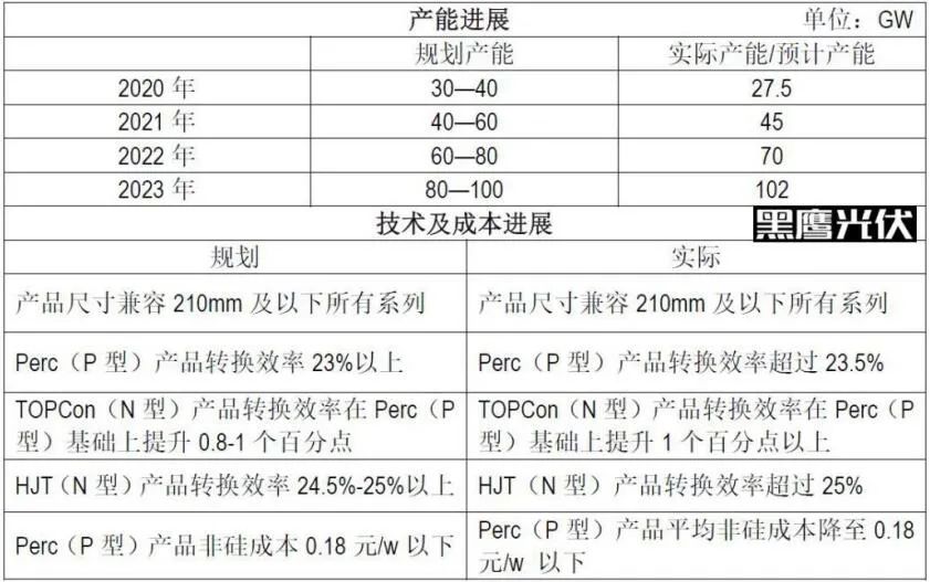 具體到太陽能電池業(yè)務(wù):根據(jù)公司實(shí)際施情況2022年底公司已累計(jì)建成45GW太陽能電池產(chǎn)能,順利完成2020—2021年階段性目標(biāo);目前在建的通合二期7.5GW、金堂二期 8GW及其他擬建項(xiàng)目預(yù)計(jì)將分別于2022年、2023年投產(chǎn),屆時(shí)公司太陽能電池規(guī)模達(dá)到102GW,綜合目前技術(shù)、成本指標(biāo)情況 綜合目前技術(shù)、成本指標(biāo)情況,公司將超額完成四年中期規(guī)劃目標(biāo),具體情況如下表: