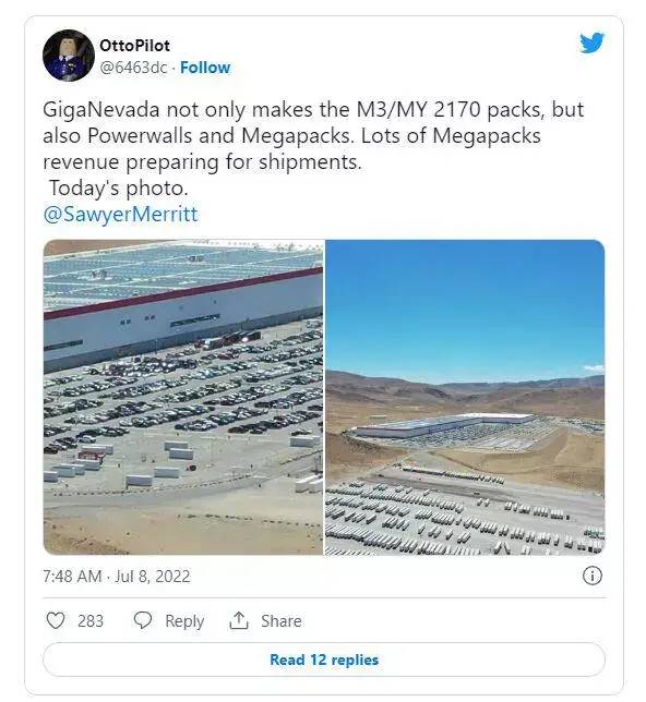 一位名叫OttoPilot的Twitter用戶操作無(wú)人機(jī)飛過(guò)內(nèi)華達(dá)州Gigafactory,在工廠外發(fā)現(xiàn)了數(shù)量驚人的特斯拉Megapack。