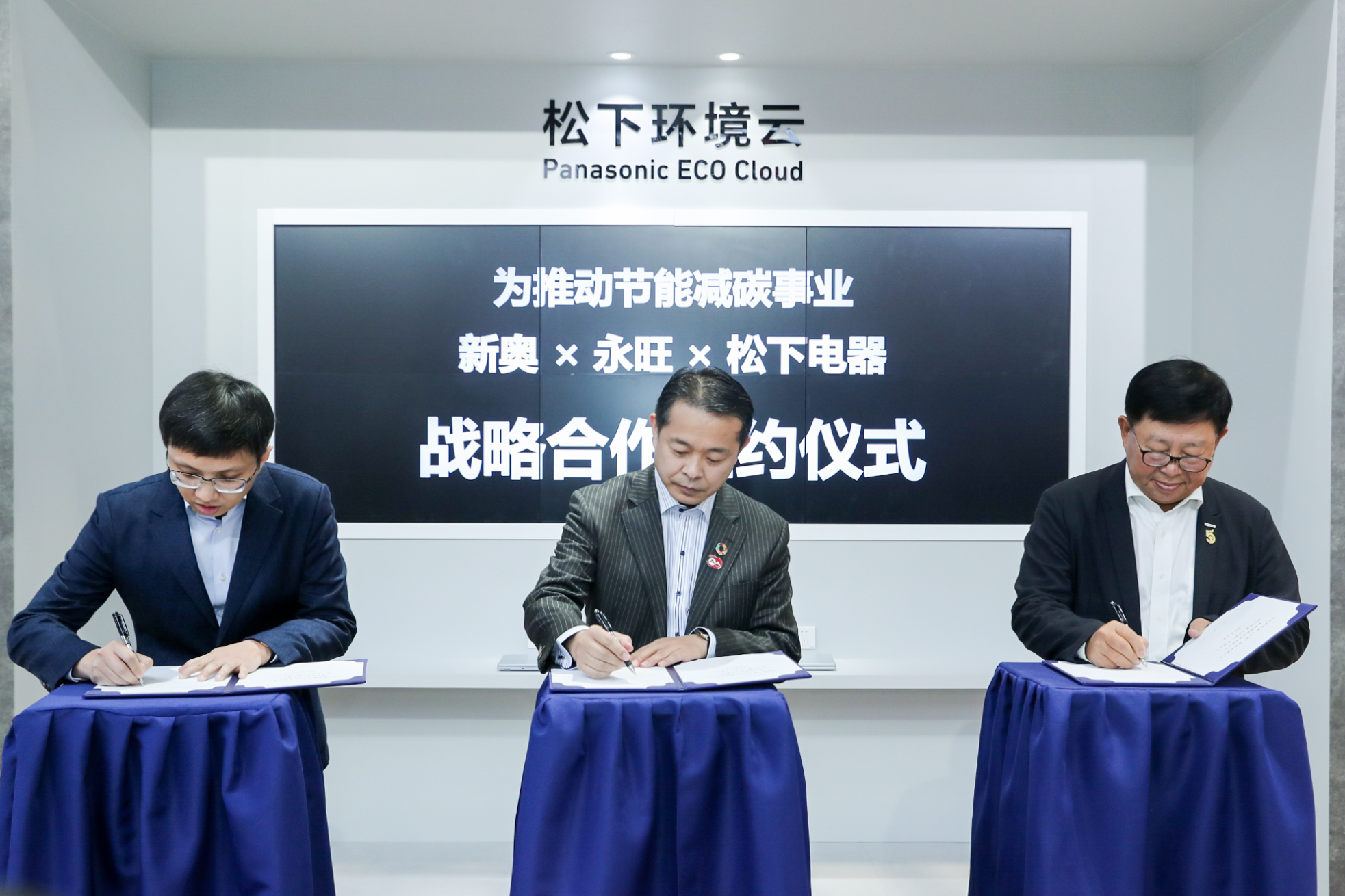 簽約會現場,新奧數能科技有限公司總裁程路、松下電器(中國)有限公司總裁趙炳弟、永旺夢樂城(中國)投資有限公司總經理齋藤作為各方代表,簽署了合作意向書,三家公司將在中國攜手開展節能減碳事業,逐步實現我國政府提出的脫碳計劃。