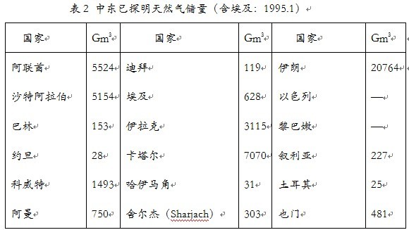表2詳細的列舉了中東地區(qū)的天然氣儲量(包括埃及),而最大的天然氣儲量是在海灣地區(qū),尤其實在伊朗、卡塔爾、阿拉伯聯(lián)合酋長國、沙特阿拉伯等國,而其他國家則很少甚至沒有天然氣田。除此之外,敘利亞和埃及的探明儲量分別是200Gm3和600Gm3。