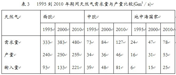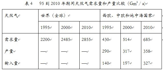 表3對西歐、中歐和地中海國家(包括埃及、敘利亞、以色列、約旦、黎巴嫩和土耳其)近期天然氣產(chǎn)量和需求量作了比較。表4則將西歐、中歐和地中海國家等三個地區(qū)與全球的需求量和產(chǎn)量進行了分析對比。