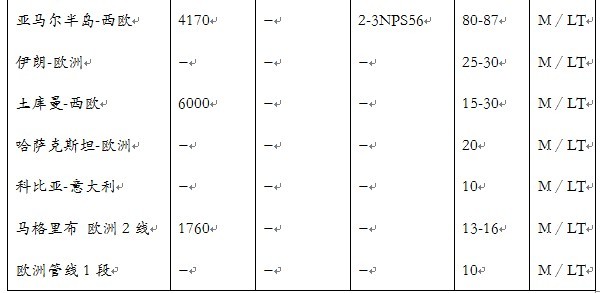 西歐和近東潛在的天然氣需求量呈增長態(tài)勢,為此,對于有些天然氣輸送系統(tǒng)提出了各種建議和方案,某些正在完成之中,有些已經(jīng)完成(表5-6)。