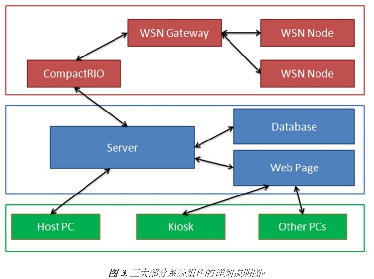 該系統(tǒng)由3個(gè)主要部分組成(如圖2與圖3所示)。紅色是系統(tǒng)進(jìn)行數(shù)據(jù)采集的部分,許多地點(diǎn)都采用相同的架構(gòu)。其中的構(gòu)成要素包含CompactRIO設(shè)備,其采集數(shù)據(jù)的方式分為兩種:通過(guò)WSN網(wǎng)關(guān)無(wú)線采集,或通過(guò)直接連接的傳感器進(jìn)行實(shí)際采集。CompactRIO設(shè)備采集數(shù)據(jù)后便會(huì)將數(shù)據(jù)傳輸至中央服務(wù)器,以便執(zhí)行存儲(chǔ)、后續(xù)處理、網(wǎng)絡(luò)代管等操作。運(yùn)作中的服務(wù)器(以藍(lán)色標(biāo)識(shí))則會(huì)從CompactRIO系統(tǒng)采集數(shù)據(jù),如果數(shù)據(jù)損壞或失去通信功能的話,會(huì)發(fā)出警示音。此外數(shù)據(jù)會(huì)存儲(chǔ)在數(shù)據(jù)庫(kù)內(nèi),并且發(fā)布到網(wǎng)上以便其他用戶監(jiān)測(cè)。