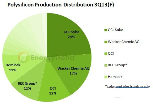 EnergyTrend表示,由于市場不確定因素仍多,多數(shù)多晶矽業(yè)者近期暫停產(chǎn)能擴(kuò)充計劃,僅少數(shù)業(yè)者如Tokuyama仍按計劃完成產(chǎn)能擴(kuò)建,其馬來西亞廠第一階段6,200噸產(chǎn)能多數(shù)將以半導(dǎo)體產(chǎn)品為主,僅少量供給太陽能業(yè)者使用;全球前五大業(yè)者(GCL, OCI, Wacker, REC, Hemlock不按排名)上半年出貨占全球75%以上,展望第三季仍將維持此一狀況(見圖)。