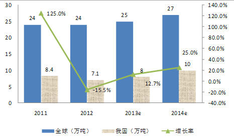 圖1 2011-2014年我國多晶硅產量、增長率及全球多晶硅產量