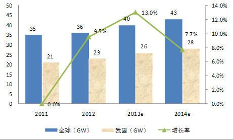 展望2014年,在光伏發電成本的持續下降、政策的持續利好和新興市場快速興起等有利因素的推動下,全球光伏市場仍將持續擴大。預計2014年全球光伏新增裝機量將達到43GW,我國將達到12GW,大型電站和分布式發電均為6GW左右。但由于電網建設規劃尚未出臺,且電站審批權下放,地方政府為追求本地利益最大化,濫批亂批電站建設,恐導致光伏電站建設與電網建設不協調,滋生限電棄光等問題。此外,分布式發電商業模式尚未成熟,潛在風險點較多,規模化推廣阻力仍較大。