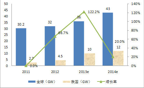 圖3 2011-2014年我國光伏新增裝機量、增長率及全球新增裝機量