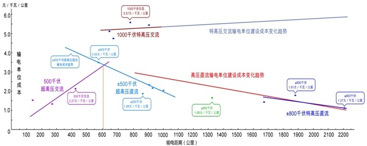 3.得到的結果是可以形成遠距輸電的規律,而不是個案說法:如果我們把中國遠距輸電工程的造價進行整理,就可以得到這樣的規律:6、7百公里以下,采用交流超高壓輸電最經濟,輸電以遠采用直流輸電,交流特高壓輸電至少要貴出一倍,沒有適用的經濟距離。可用下圖表示。