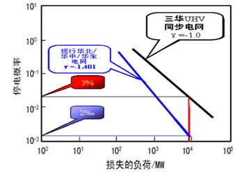 在圖6中左邊藍(lán)色曲線表示現(xiàn)行中國“三華”電網(wǎng)中每個區(qū)域電網(wǎng)的冪律特性(負(fù)冪指數(shù)-γ=1.401),形成“三華”交流特高壓電網(wǎng)后的冪律特性接近于美國東部電網(wǎng)的特性(右側(cè)黑色曲線,負(fù)冪指數(shù)-γ=1.0)。這樣在發(fā)生同樣損失800萬千瓦規(guī)模以上的大停電事故的情況下,“三華”特高壓同步電網(wǎng)發(fā)生事故的概率為現(xiàn)在分區(qū)運行情況下發(fā)生事故概率的15倍。