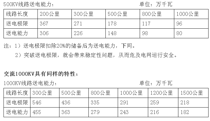 上述有效的數據表明,雖然1000KV電壓與500KV電壓的送電能力提高了2~3倍,卻同樣擺脫不了交流輸電穩定性基本規律的制約:當送電距離為300公里時送電能力455萬千瓦;當送電距離達到1500公里時,送電能力降到182萬千瓦。如果要遠距輸送功率,必需每隔約300公里建變電站,取得超高壓電網的足夠大的電源支撐,造成安全隱患和工程費上升。