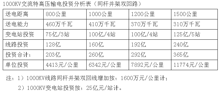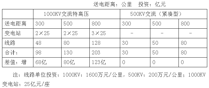從上表可以清楚看出,1000KV線路送電800公里,送電能力為460萬千瓦,工程投資203億元,折合每公里輸電單位造價4413元/公里;當送電距離增加到1500公里時,送電能力下降到310萬千瓦,而輸電投資增加到365億元,折合到每公里輸電單位造價11774元/公里,增加了2.67倍。