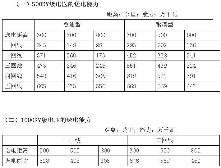 在進行建設方案比較時,上述兩張表相關數據表明,500KV電壓級的送電能力要達到460-680萬千瓦,送電回路數大約需要5回(緊湊型),也就是說,1000KV級電壓的送電能力大約為500KV級電壓送電能力的2.5倍。