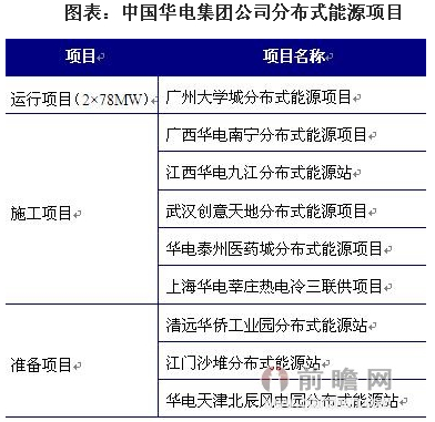 前瞻網分布式能源研究報告顯示,國內從事分布式能源投資的發電集團主要是我國的五大發電集團,即中國華能集團公司、中國大唐集團公司、中國華電集團公司、中國國電集團公司、中國電力投資集團公司。其中,華電集團是我國天然氣分布式能源項目起步最早,開發項目最多的發電企業,同時,公司還積極發展風電、太陽能發電、生物質發電、小水電等其它類型的分布式能源。華電集團已取得天津、上海、廣東等十幾個省區近100萬千瓦分布式能源核準批復,占全國的三分之二。其典型項目如下: