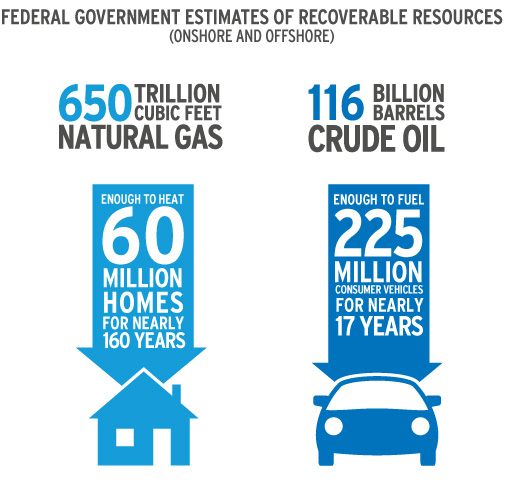 保守估計(jì),在美國(guó)各地原油與天然氣儲(chǔ)備大約是1500億桶,相當(dāng)于沙特阿拉伯。美國(guó)聯(lián)邦持有大約1160億桶原油和650萬(wàn)億立方英尺天然氣。這些原油可以供應(yīng)大約22500萬(wàn)私人車輛使用17年,6000萬(wàn)個(gè)家庭使用大約160年。