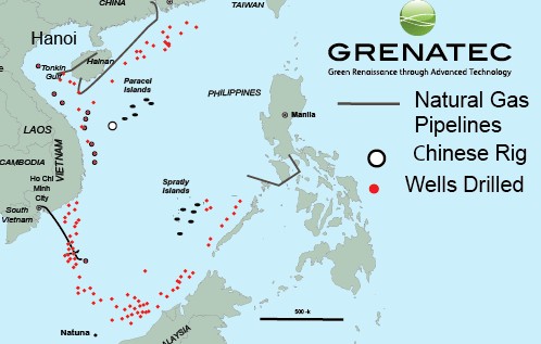 下圖是某國外機構制作的南海油井分布圖,可以看出南海南端以及菲律賓、越南、馬來西亞近海地區,油井已經是密密麻麻。這也是為什么房峰輝總參謀長說“南海地區很多相關國家打了很多井,但中國沒有打一口井。”中國提出的“擱置爭議共同開發”的良好愿望一再被有關國家無視,中國這才被迫在這一區域開始打第一口井——鉆井平臺981。981鉆井平臺距離中建島只有17海里,也在中國劃定的九段線之內。