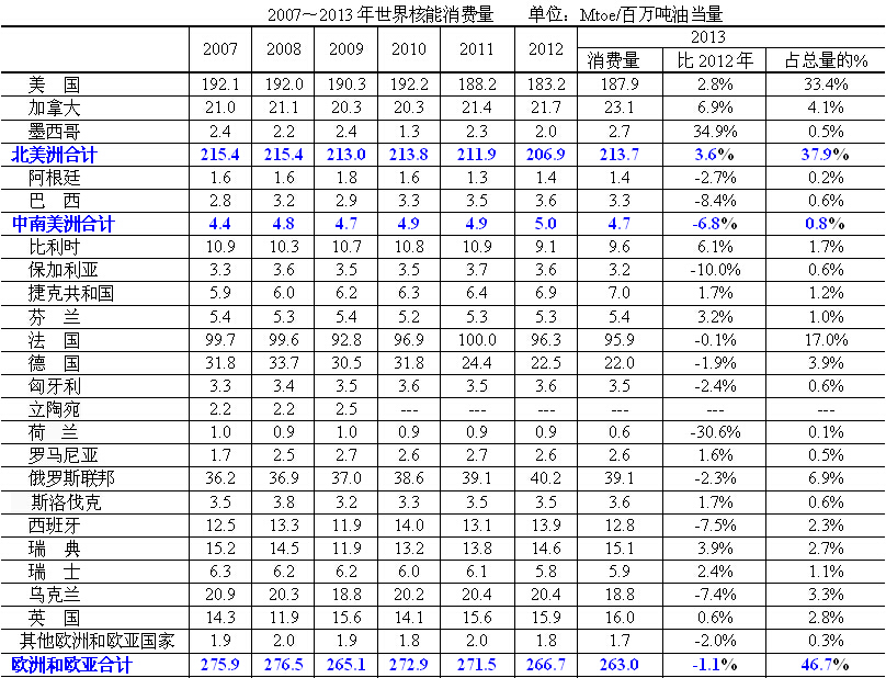 2013年核能消費(fèi)最多的地區(qū)是歐洲和歐亞大陸,占全球總量的46.7%,其次是北美洲,占37.9%。