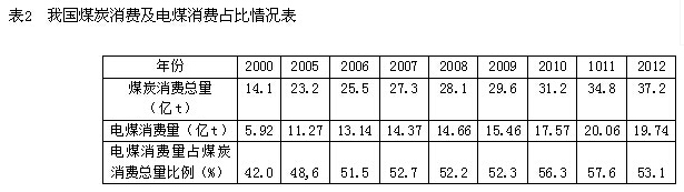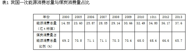 億噸標(biāo)準(zhǔn)煤, 其中煤炭消費(fèi)量占能源消費(fèi)總量的69.2%,隨著我國(guó)經(jīng)濟(jì)進(jìn)入新一輪快速增長(zhǎng)通道,經(jīng)濟(jì)結(jié)構(gòu)重型化加劇,能源需求快速增長(zhǎng),能源結(jié)構(gòu)也呈逆轉(zhuǎn)之勢(shì), 2006-2007年煤炭消費(fèi)量占能源消費(fèi)總量達(dá)到71.1%的頂點(diǎn),2008年受國(guó)際金融危機(jī)的影響,我國(guó)能源需求增長(zhǎng)減緩,煤炭消費(fèi)量占能源消費(fèi)總量的比例逐漸下降到2010年的68.0%。近三年來(lái),煤炭在我國(guó)一次能源消費(fèi)中的比重以每年接近1%的速度下降,從2011年的68.4%到2013年的65.7%,詳見(jiàn)表1。預(yù)計(jì)未來(lái)相當(dāng)長(zhǎng)一段時(shí)期內(nèi)煤炭仍將成為我國(guó)第一大能源消費(fèi)選擇,其比重下降緩慢。