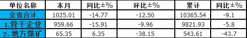 其中,骨干企業(yè)產量959.66萬噸,同比減少181.51萬噸,下降15.91%,環(huán)比減少106.14萬噸,下降9.96%。1-9月累計生產煤炭9821.93萬噸,同比減少609.30萬噸,下降5.8%。