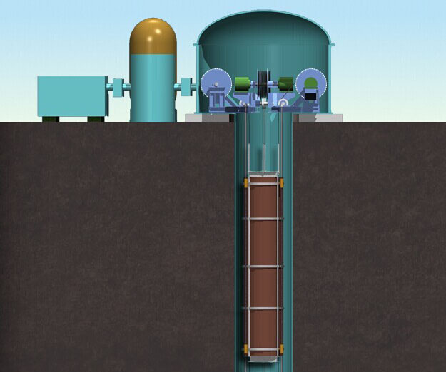 其實,可以將這一系統看成一個巨大的鐘錘,用密度高又便宜的金屬制成的圓柱形重物用些鋼纜或繩子(現代高強度合成纖維最好不過)吊在洞中,每條繩索連接一個絞車,儲電時抬高重物,放電時降低重物。所有的繩索張力是能夠自動平衡同步的,這可以防止重物擺動而傷害到軸承等部件。整個絞盤系統可以通過電驅動器精確控制,保持重物的平穩。