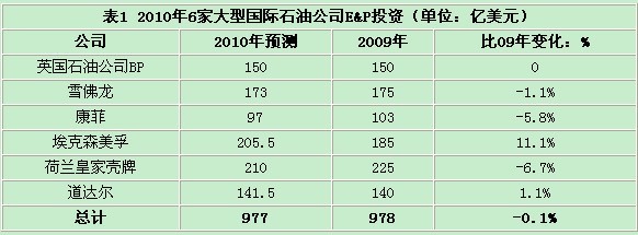 調(diào)查顯示,2010年國際大石油公司在北美E&P投資將有所下降,但在北美以外地區(qū)的投資將有小幅度增長。預(yù)計全球6大國際石油公司在全球E&P投資將減少0.1%(表1),其中BP、雪佛龍和道達爾與2009年基本持平,康菲和殼牌分別下降5.8%和6.7%,而埃埃克森美孚則增長11.1%。