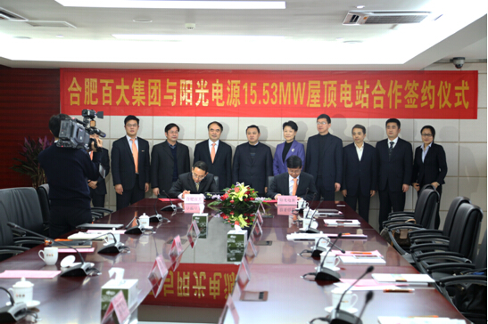 1月21日,陽光電源股份有限公司與合肥百大集團15.53兆瓦屋頂光伏電站項目簽約儀式成功舉行,標志著國內最大的商用屋頂光伏電站將落地合肥。合肥市副市長陳曉波、市政府副秘書長汪維民、市國資委副主任張毅、市經信委副主任黃群英,以及合肥百大集團董事長鄭曉燕、陽光電源董事長曹仁賢等出席了簽約儀式。