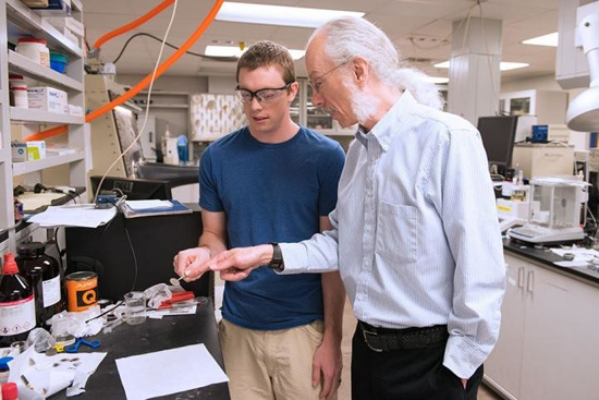亞利桑那州立大學(xué)化學(xué)與生物化學(xué)系的DanButtry教授正與本科生TylanWatkins測試電池樣品
