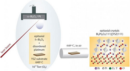 該團(tuán)隊使用脈沖激光沉積技術(shù)共沉積外延的δ-Bi2O3和無序的金屬鉑。薄膜在空氣中退火,使得鉑被氧化,形成長度約100納米的外延Bi2Pt2O7晶體。