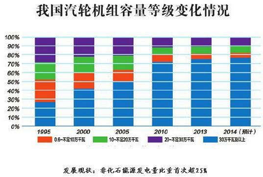2014年,火電結構進一步優化,技術水平進一步提高。高參數、大容量、高效環保型機組比例進一步提高。據中電聯初步統計,截至2014年底,全國30萬千瓦及以上火電機組比例達到77.7%,比2013年提高近1.4個百分點;2005~2014年累計關停小火電機組預計超過0.95億千瓦。