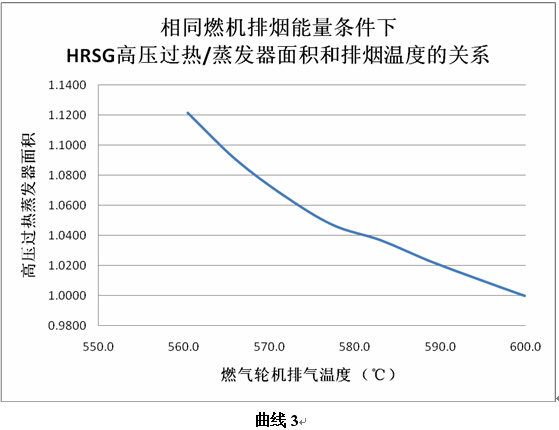 由于燃氣輪機排煙溫度下降,導致余熱鍋爐高壓過熱器和蒸發器的傳熱溫差下降,余熱鍋爐的高壓過熱器和蒸發器的換熱面積就需要增加,從而導致余熱鍋爐造價的增加。下圖曲線3是在相同燃機排煙能量的條件下,HRSG高壓過熱器和蒸發器的換熱面積和燃氣輪機排煙溫度的關系曲線。