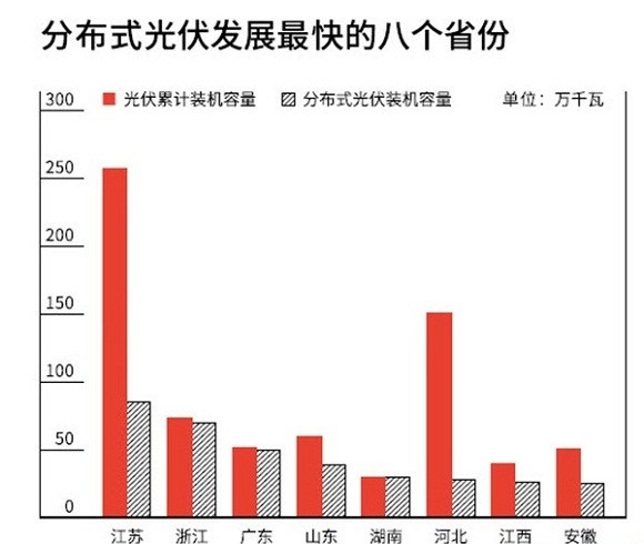 他的判斷基于一個(gè)行業(yè)共識(shí):中國的分布式光伏市場正在升溫。所謂分布式光伏,通常指將小型光伏發(fā)電系統(tǒng)安裝在家庭住宅或工商業(yè)建筑屋頂、院落內(nèi),以業(yè)主自發(fā)自用、余電上網(wǎng)的方式運(yùn)行。在光伏發(fā)電起步較早的歐美市場,分布式光伏是太陽能利用的主要方式。德國近九成的光伏發(fā)電來自分布式光伏系統(tǒng),家庭住宅屋頂電站數(shù)量超過100萬個(gè);美國去年新增分布式光伏發(fā)電的裝機(jī)容量達(dá)到220萬千瓦。
