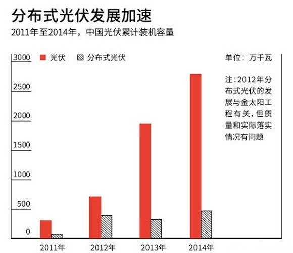 在中國,集中式大型地面電站目前仍是光伏發(fā)電的主要實(shí)現(xiàn)方式。截至2014年,中國光伏發(fā)電累計(jì)并網(wǎng)裝機(jī)容量2805萬千瓦。其中,地面電站2338萬千瓦,分布式光伏僅有467萬千瓦。然而,考慮到土地資源、電網(wǎng)送出能力和國家補(bǔ)貼資金壓力等諸多限制因素,很多業(yè)內(nèi)人士都向財(cái)新記者表達(dá)了相似的觀點(diǎn),即地面電站的發(fā)展將在未來三年內(nèi)逐步放緩,而各種分布式將是發(fā)展方向。