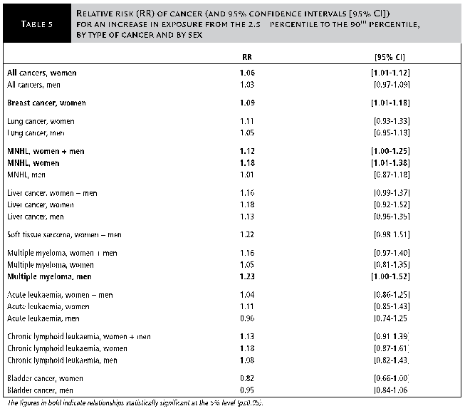 如上表所示,垃圾焚燒廠空氣污染物暴露與癌癥病發具有統計顯著性(95%置信區間,RR>1)的癌癥效應為:女性乳腺癌、惡性非霍奇金淋巴瘤和所有癌癥合計,男性多發性骨髓瘤,兩性合計的惡性非霍奇金淋巴瘤。而趨近具有統計顯著相關性的癌癥效應包括:兩性合計的軟組織肉瘤、肝癌、多發性骨髓瘤。