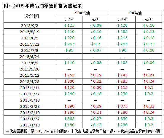 ICIS安迅思2015年9月1日訊——根據國家發改委本周二(9月1日)下午17時發布的通知,汽柴油最高零售價下調兌現,其中汽油下調125元/噸,柴油下調120元/噸,折合升價分別是0.09元/升和0.10元/升,調價執行時間為9月1日24時。2015年內成品油零售限價一共下調9次,此次六連跌兌現后,局部地區零售價格將出現“4”開頭。