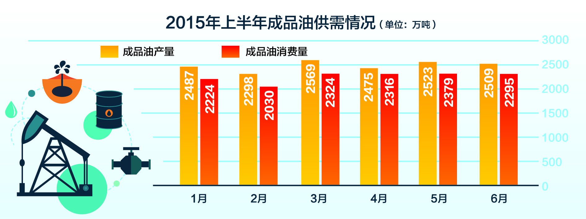 受國際原油價格影響,今年上半年國內成品油價格“五漲四跌三擱淺”,相較于去年6月至今年6月汽、柴油分別下調1747元/噸和1975元/噸而言,總體呈微幅上漲,總計汽油和柴油分別累計上調460元/噸和385元/噸。國際油價在3月中旬跌至6年來的歷史低位43.46美元/桶,盡管第二季度反彈幅度高達30%,但由于伊朗核問題協議達成、希臘債務危機等原因,導致石油供需格局并沒有發生有效轉變,油價也不具備大幅上漲的動力。預計下半年布倫特國際油價仍將維持在45~75美元的水平。因此,國際原油價格仍將保持低位震蕩,國內成品油價仍有下跌可能。