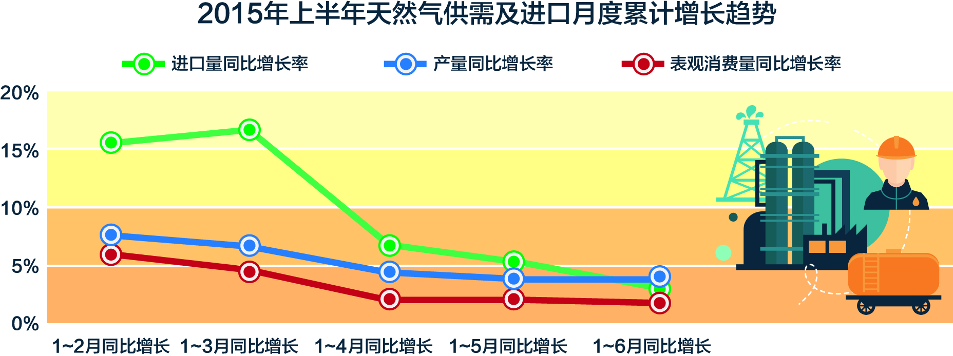 數據顯示,今年上半年天然氣進口量為293億立方米,增長3.5%。一季度,天然氣進口量約160億立方米,主要為管道氣和LNG進口,分別為93億立方米和68億立方米,同比增長16.5%。但由于二季度天然氣進口量銳減,導致上半年天然氣進口量同比增幅降至3.5%,比2014年12.6%的增幅下跌約9個百分點。