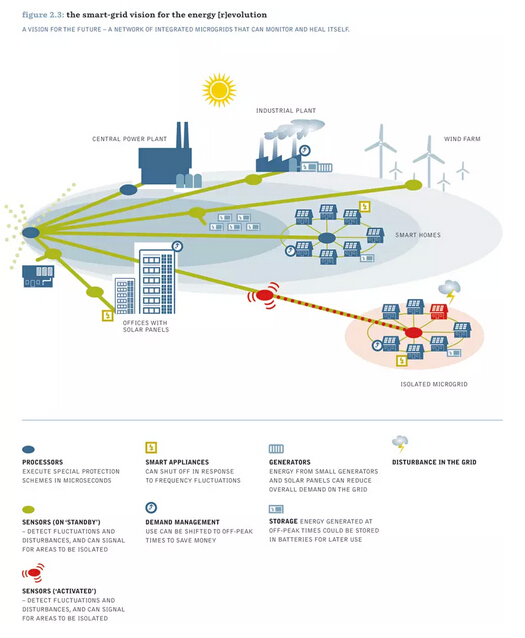 電網(wǎng)——連接電站同消費(fèi)者的系統(tǒng)——可以處理大量的可再生能源。在目前使用的電網(wǎng)模式上增加風(fēng)能和太陽(yáng)能不是解決之道。我們所需要的是整個(gè)能源系統(tǒng)的漸進(jìn)轉(zhuǎn)換,以適應(yīng)現(xiàn)代能源的生產(chǎn)和消費(fèi)。